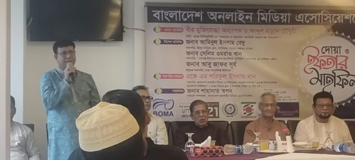 ইফতার সন্ধ্যায় সভাপতির বক্তব্যে অনলাইন মিডিয়া অ্যাসোসিয়েশন কে সার্বিক সহযোগিতার জন্য সংশ্লিষ্টদের ধন্যবাদ জানান অ্যাসোসিয়েশনের সভাপতি সাংবাদিক নেতা শরিফুল ইসলাম খান। তিনি বলেন, দেশের গুরুত্বপূর্ণ বেশ কিছু অনলাইন গণমাধ্যম এখনো নিবন্ধন এর আওতায় আসেনি। তথ্য মন্ত্রণালয়ের উচিত এসব গণমাধ্যমকে নিবন্ধনের আওতায় এনে অনলাইন গণমাধ্যম উন্নয়নে সরকারের পক্ষ থেকে সব ধরনের সহযোগিতা করা।