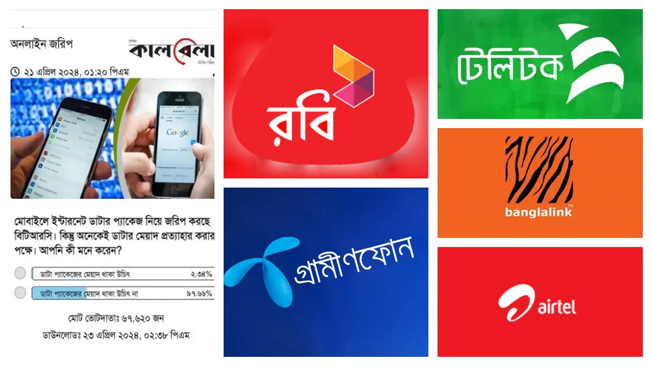 কালবেলার মতামত জরিপে বলা হয়, মোবাইলে ইন্টারনেট ডাটার প্যাকেজ নিয়ে জরিপ করছে বিটিআরসি। কিন্তু অনেকেই ডাটার মেয়াদ প্রত্যাহার করার পক্ষে। আপনি কী মনে করেন? এই প্রশ্নের দুটি উত্তর রাখা হয়। প্রথমটি, ডাটা প্যাকেজের মেয়াদ থাকা উচিত্? দ্বিতীয়টি, ডাটা প্যাকেজের মেয়াদ থাকা উচিত্ না। এখানে দ্বিতীয় উত্তরে সমর্থন করেছেন ৯৭ দশমকি ৬৬ শতাংশের বেশি মানুষ। আর ডাটা প্যাকেজের মেয়াদ থাকার পক্ষে মতামত দিয়েছেন ২ দশমিক ৩৪ শতাংশ মানুষ।