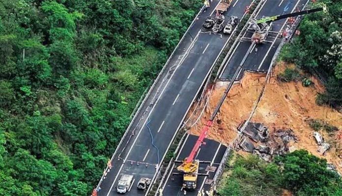 কয়েকদিনের বৃষ্টিপাতের পর গুয়াংডংয়ের মেইঝো শহর এবং ডাবু কাউন্টির মধ্যকার ওই মহাসড়কের ১৭ দশমিক ৯ মিটার (৫৮.৭ ফুট) অংশ ধসে পড়ে।