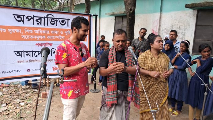 নিজস্ব প্রতিনিধিঃ ‘ফুলকি’র আয়োজনে এবং সেভ দ্যা চিলড্রেনের সহযোগিতায় ও এইচ এন্ড এম ফাউন্ডেশনের অর্থায়নে শিশু নির্যাতন, শিশু অধিকার, সুরক্ষা ও পুষ্টির ব্যাপারে সামাজিক সচেতনতা ও উদ্যোগের অংশ হিসেবে রবিবার দুপুর ১২টায় গাজীপুর সিটি কর্পোরেশন এর ৬ নং ওয়ার্ডের কাশিমপুর স্কুলের সামনে এবং বিকাল ৪টায় সাভারের ইয়ারপুর ইউনিয়নের শিমুলতলা খ্রিষ্টান মাঠে প্রদর্শিত হয় শেকানুল ইসলাম শাহী রচিত ও নির্দেশিত পথনাটক ‘আমাদের শিশুরা’।