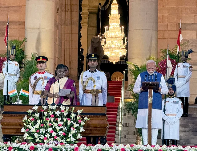 জওহরলাল নেহরুর পর প্রথম নেতা হিসেবে তৃতীয়বারের মতো ভারতের প্রধানমন্ত্রী হলেন নরেন্দ্র মোদি। আজ রোববার সন্ধ্যায় নয়াদিল্লিত রাষ্ট্রপতি ভবনের আঙিনায় তাঁকে শপথ পড়ান ভারতের রাষ্ট্রপতি দৌপদী মুর্মুছবি: এএনআই