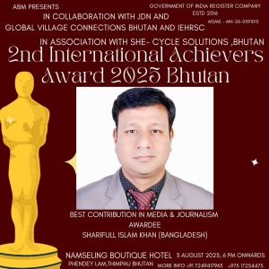 ঢাকাঃ ভুটানের রাজধানী থিম্পুতে অনুষ্ঠিত হলো ‘ইন্টারন্যাশনাল অ্যাচিভার্স অ্যাওয়ার্ড ২০২৫’। বৃহস্পতিবার (৭ আগস্ট) গ্লোবাল ভিলেজ কানেকশনস-এর আয়োজনে এবং সার্কভুক্ত দেশ ভারত, বাংলাদেশ, নেপাল ও ভুটানের অংশগ্রহণে জমকালো আয়োজনে সাজে এই অনুষ্ঠান হয়।