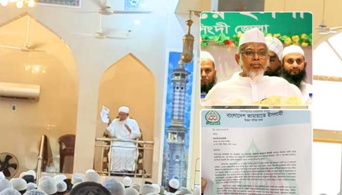 এরপর তিনি মুসল্লিদের সামনে জামায়াতের পাঠানো চিঠিটি প্রদর্শন করে বলেন, এটি আমি গ্রহণ করছি না। তাঁর বক্তব্য শেষে উপস্থিত মুসল্লি ও মসজিদ কমিটির সদস্যরা নারায়ে তাকবির, আল্লাহু আকবার ধ্বনি দেন, এবং খতিব নিজ হাতে চিঠিটি ছিঁড়ে ফেলেন।