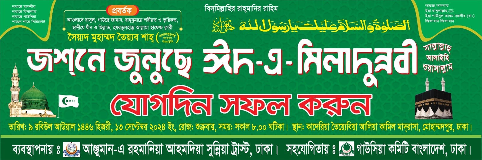 ঈদ-এ মিলাদুন্নবীর জশনে জুলুছে ﷺ আগামীকাল ১৩ সেপ্টেম্বর রোজ শুক্রবার সকাল ৯ ঘটিকায় ঢাকার মোহাম্মপুরস্থ কাদেরিয়া তৈয়্যেবিয়া আলিয়া কামিল মাদরাসা প্রাঙ্গণ হতে শুরু হবে। উক্ত পবিত্র ঈদ-এ মিলাদুন্নবী জশনে জুলুছে এ ছদারত করবেন আওলাদে রাসূল, পীরে বাঙ্গাল, আল্লামা সৈয়্যদ মুহাম্মদ সাবের শাহ মাদ্দাজিল্লুহুল আলী। ঢাকার হজরত শাহজালাল আন্তর্জাতিক বিমানবন্দরে গতকাল রাত ১০.২০ সুদূর পাকিস্তান থেকে বাংলাদেশের জমিনে তাশরিফ এনেছেন। আজ ৯ই রবিউল ঢাকায় এবং ১২ই রবিউল আউয়াল চট্টগ্রামে ঈদে মিলাদুন্নবীর জশনে জুলুছে যোগ দেওয়ার কথা আছে।