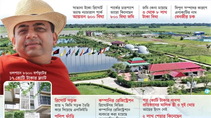 যৌথ মূলধনী ফার্মসমূহের পরিদপ্তর থেকে একটি নথি কালের কণ্ঠ’র হাতে এসেছে। সেটি বিশ্লেষণ করে দেখা গেছে, সাবেক পুলিশ ও র্যাব কর্তা বেনজীর আহমেদ তাঁর স্ত্রী ও দুই মেয়ের নামে গোপালগঞ্জে প্রতিষ্ঠা করেছেন সাভানা অ্যাগ্রো। ২০ কোটি টাকা অনুমোদিত মূলধনধারী সাভানা অ্যাগ্রো লিমিটেডের পরিচালক তিনজন। ১০টি শেয়ারধারী স্ত্রী জীশান মীর্জা চেয়ারম্যান, সমপরিমাণ শেয়ারের অধিকারী ২৯ বছর বয়সী বড় মেয়ে ফারহিন রিসতা বিনতে বেনজীর এমডি। আর মাত্র ২৪ বছর বয়সী ছোট মেয়ে তাহসিন রাইসা বিনতে বেনজীর আছেন পরিচালক হিসেবে। প্রাপ্ত তথ্যের সত্যতা নিশ্চিত করতে সরেজমিনে যায় কালের কণ্ঠ। সেখানে দেখা গেছে, ২০ কোটি নয়, সাভানা অ্যাগ্রোর রয়েছে কয়েক শ কোটি টাকার বিনিয়োগ ও ব্যবসা।
