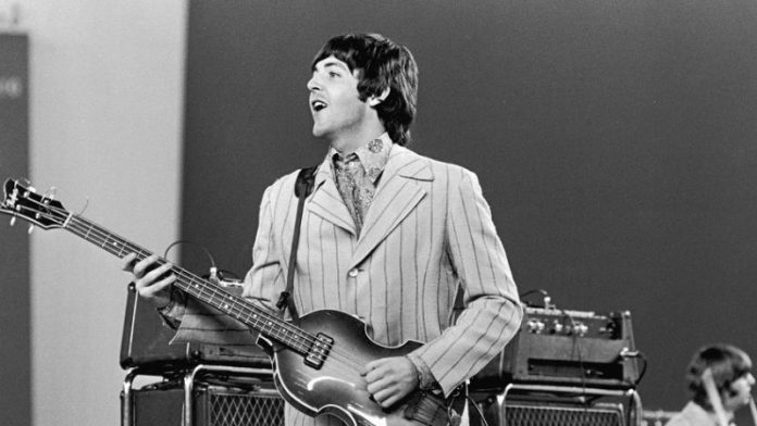 1966, British rock musician Paul McCartney playing on stage during The Beatles', last tour. Drummer Ringo Starr is visible in the background. (Photo by Getty Images/Getty Images)