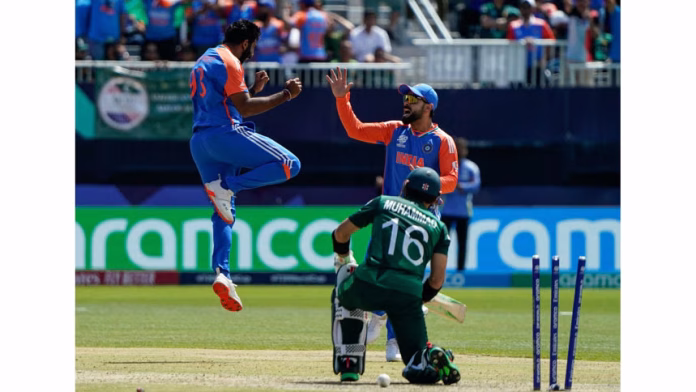 Online Desk: India’s Jasprit Bumrah (L) celebrates after dismissing Pakistan’s Mohammad Rizwan during the ICC men’s Twenty20 World Cup 2024 group A cricket match between India and Pakistan at Nassau County International Cricket Stadium in East Meadow, Jasprit Bumrah was the hero as India beat Pakistan by six runs in a low-scoring T20 World Cup thriller in New York on Sunday.