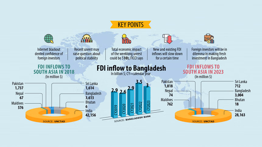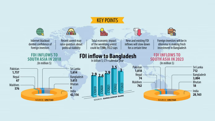 Bangladesh Bank data shows that net FDI inflow fell to $3.8 billion in the July-May period of FY24, down 6.5 percent from $4 billion during the same period the year prior.